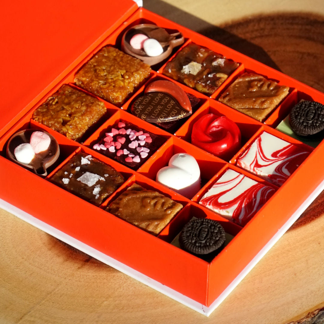 Treat your loved one with this luxury box containing 16 handcrafted brownie & blondie pieces of 9 unique flavours made using high quality ingredients. The contents of the box weigh over 400g (or 0.9lb). Fitted with a self-locking magnetic flap. Available for UK wide delivery.